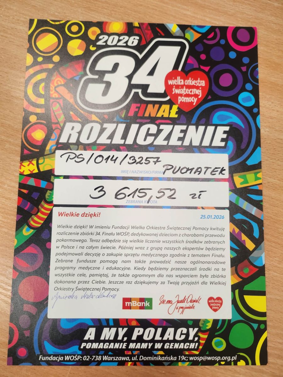 Drodzy Rodzice! Z całego serca dziękujemy za wsparcie zbiórki na rzecz Wielkiej Orkiestry Świątecznej Pomocy, która była prowadzona w naszym przedszkolu. Dzięki ogromnemu zaangażowaniu przedszkolaków oraz Państwa hojności udało się zebrać 3615,52 zł. To piękny przykład, że już od najmłodszych lat możemy uczyć dzieci wrażliwości, empatii i pomagania innym. Dziękujemy za zaufanie, otwarte serca i wspólne działanie na rzecz potrzebujących